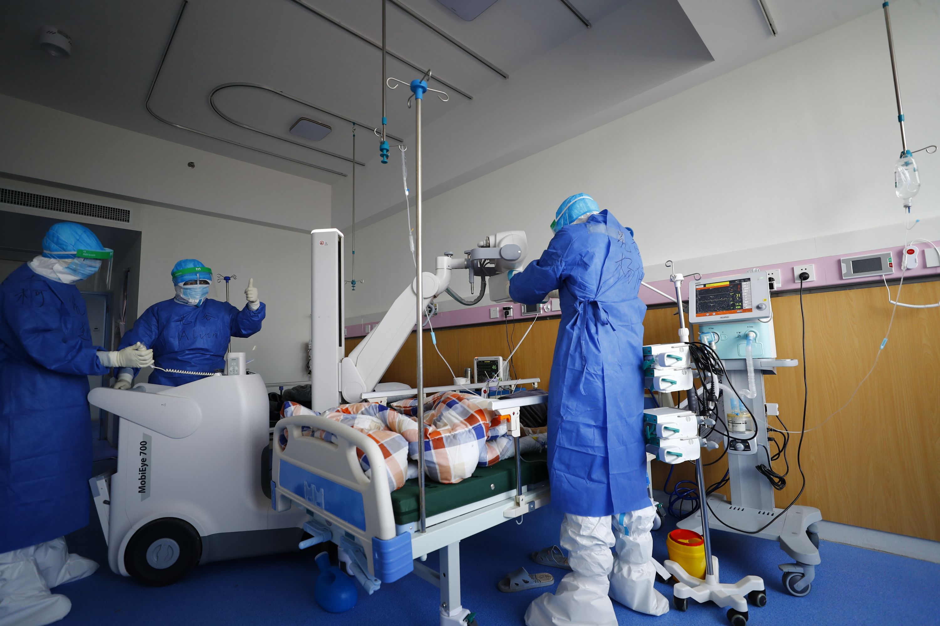 在湖北省妇幼保健院光谷院区感染二科重症病房内,医护人员为重症患者做床旁胸片检查(3月10日摄)。新华社发(王皓宇 摄)