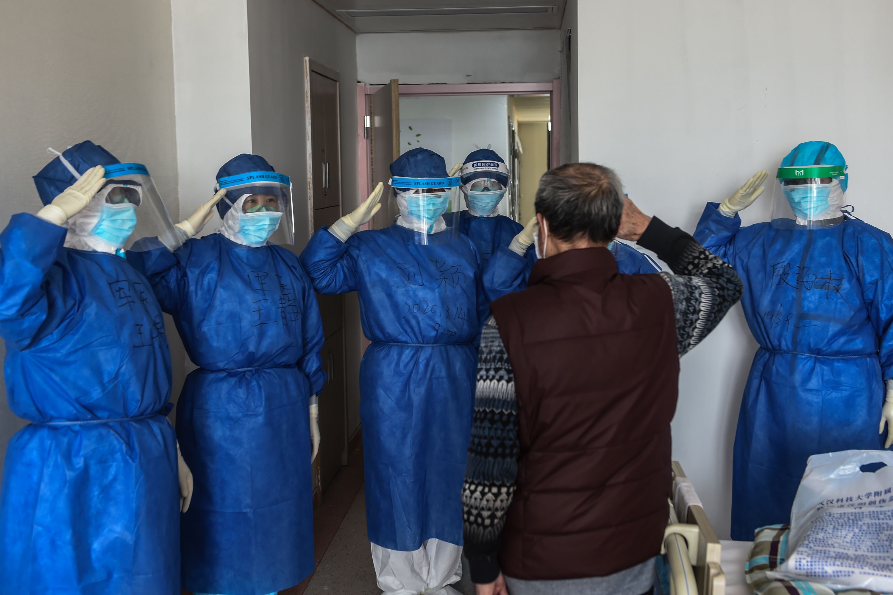 在湖北省妇幼保健院光谷院区,一名即将出院的老年患者向医护人员致敬(3月14日摄)。新华社发(赵佳庆 摄)