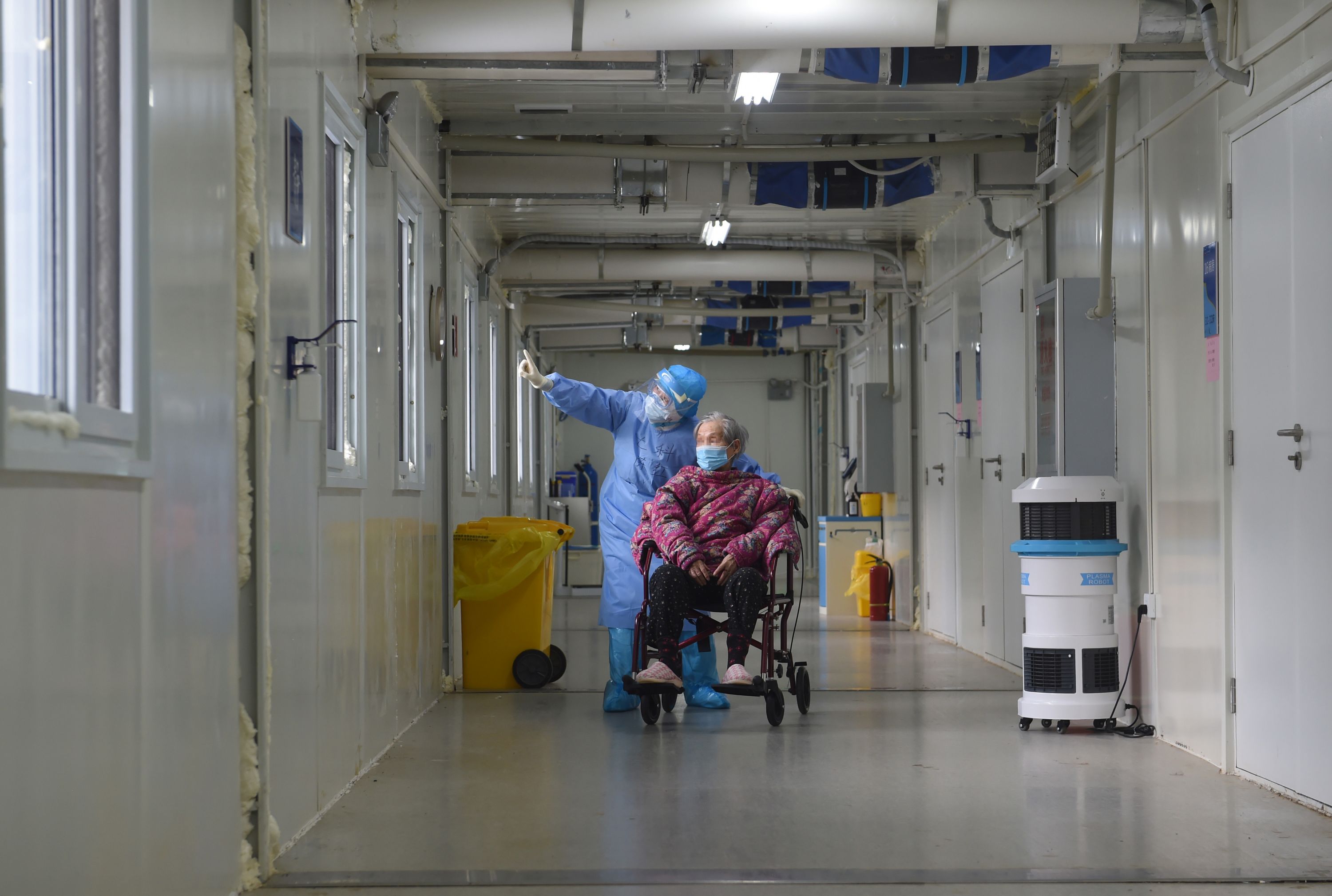 在武汉火神山医院感染七科一病区,医护人员陪同一名老年患者在病区走廊散心(3月17日摄)。新华社发(赵佳庆 摄)