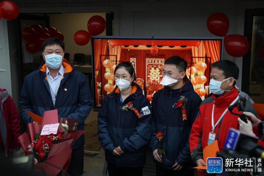 2月28日,在武汉雷神山医院,上海交通大学医学院附属仁济医院肝移植监护室护士于景海(右二)和消化科护士周玲亿(左二)举办了一场简短的“婚礼”。新华社发