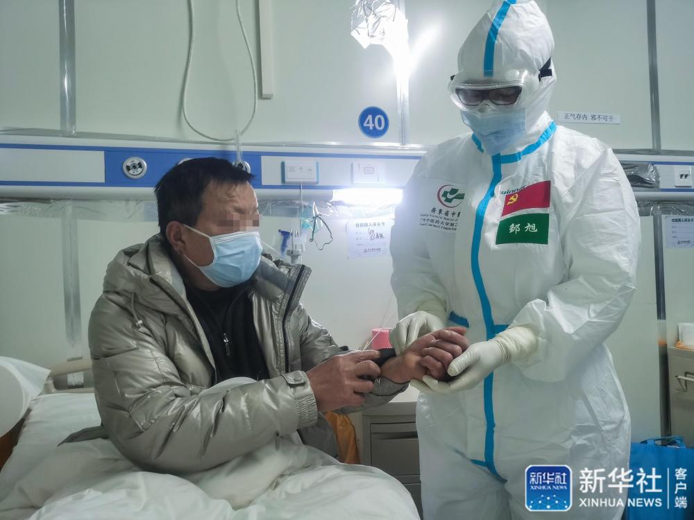 广东医疗队领队、广东中医院重症医学科主任邹旭在武汉雷神山医院为患者把脉(3月1日摄)。新华社发