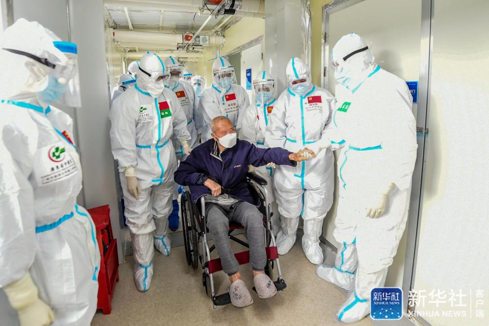 在武汉雷神山医院,广东医疗队医护人员送别病区最后一位患者(3月28日摄)。新华社发