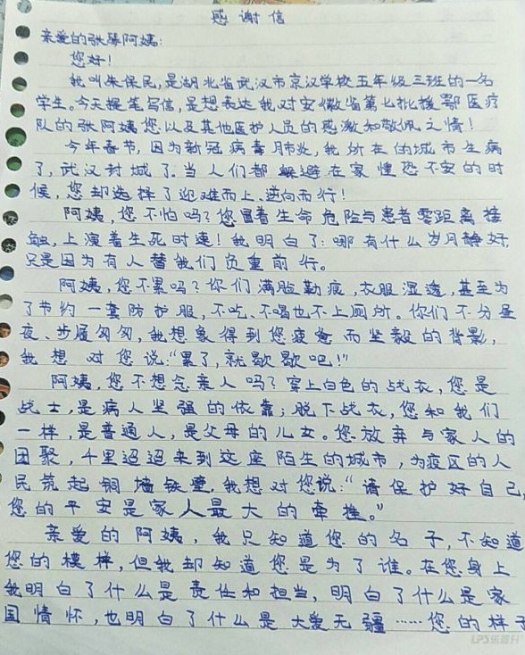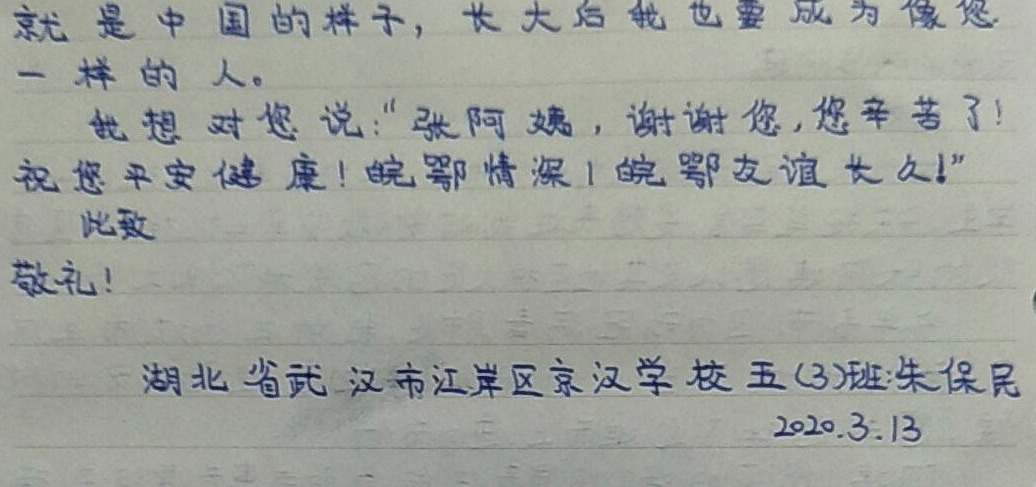 信是手写的,字迹工整,文字感人。信里这样写道:亲爱的阿姨,我只知道您的名字,不知道您的模样,但我知道您是为了谁。在您身上明白了什么是家国情怀,什么是责任和担当,明白了什么是大爱无疆。您的样子就是中国的榜样,长大后我也要成为像您一样的人……