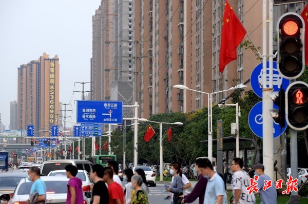 27日,武汉天气晴好,东西湖金银潭大道上的行人穿行在马路上。记者刘斌 摄
