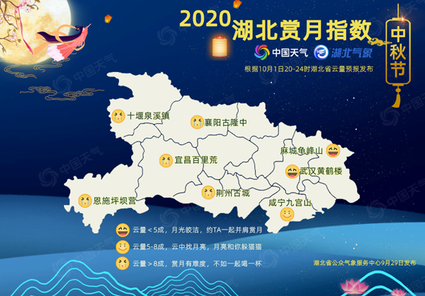 除了假期天气,大家最关心的莫过于中秋节晚上是否能观赏到圆月?今年中秋节当天(10月1日),白天湖北以多云为主,但夜间中西部有小雨出现。预计中秋节当晚(20-24时),湖北中西部地区有阴云覆盖,东部大部地区以晴到多云为主,东部地区赏月指数整体好于西部地区。