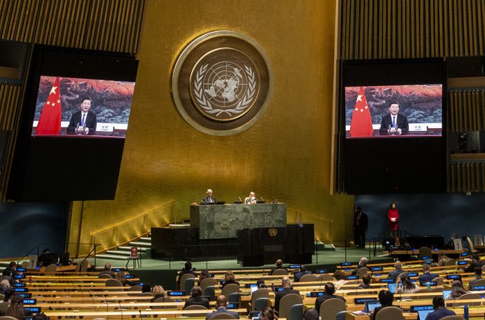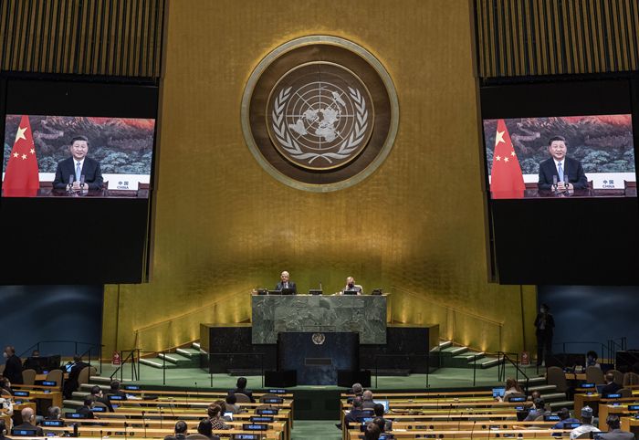 9月22日,国家主席习近平在第七十五届联合国大会一般性辩论上发表重要讲话。新华社发(联合国供图/埃瑟金德尔·德贝贝 摄)