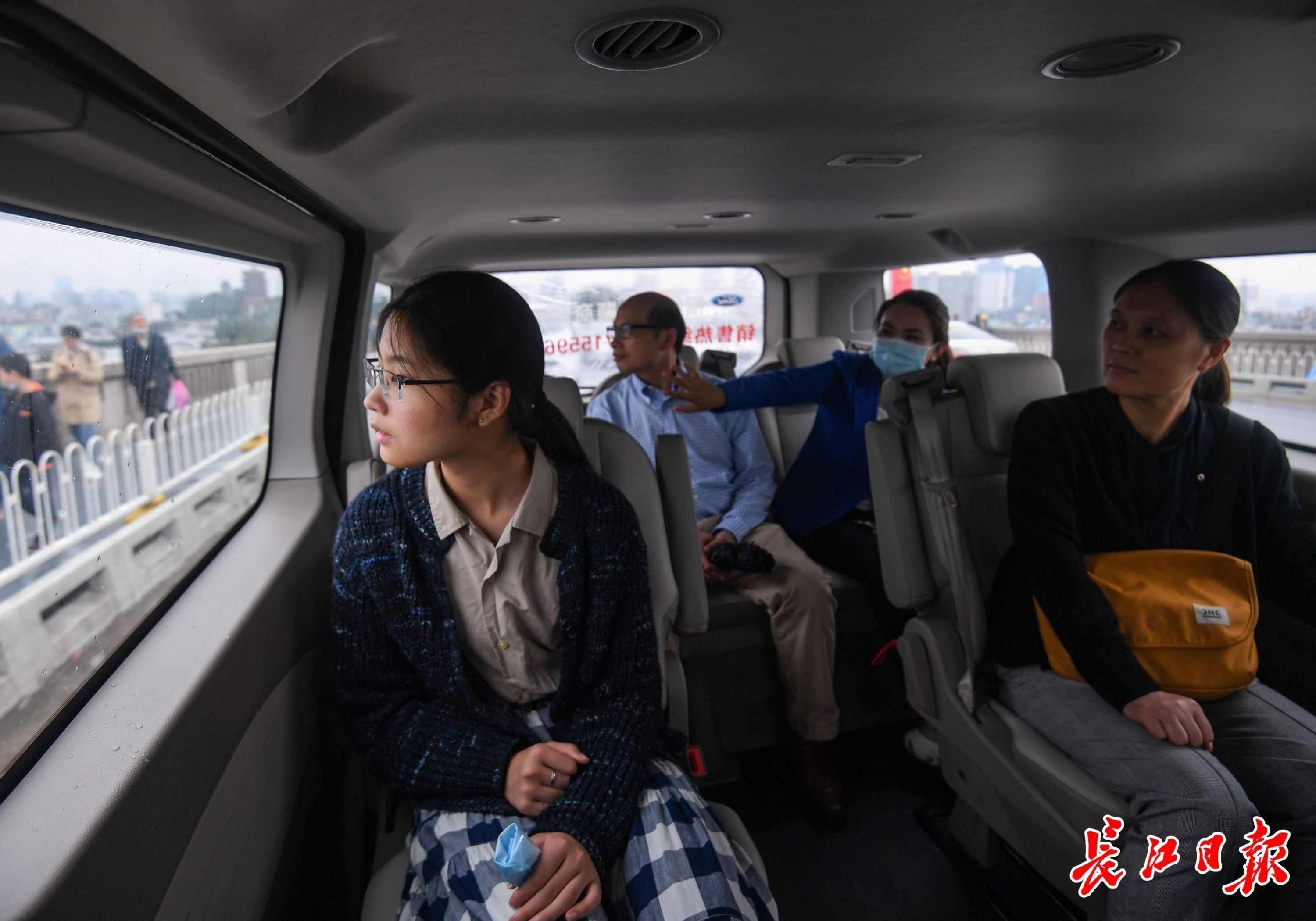 黄建芳一家人乘车通过武汉长江大桥。记者史伟 摄