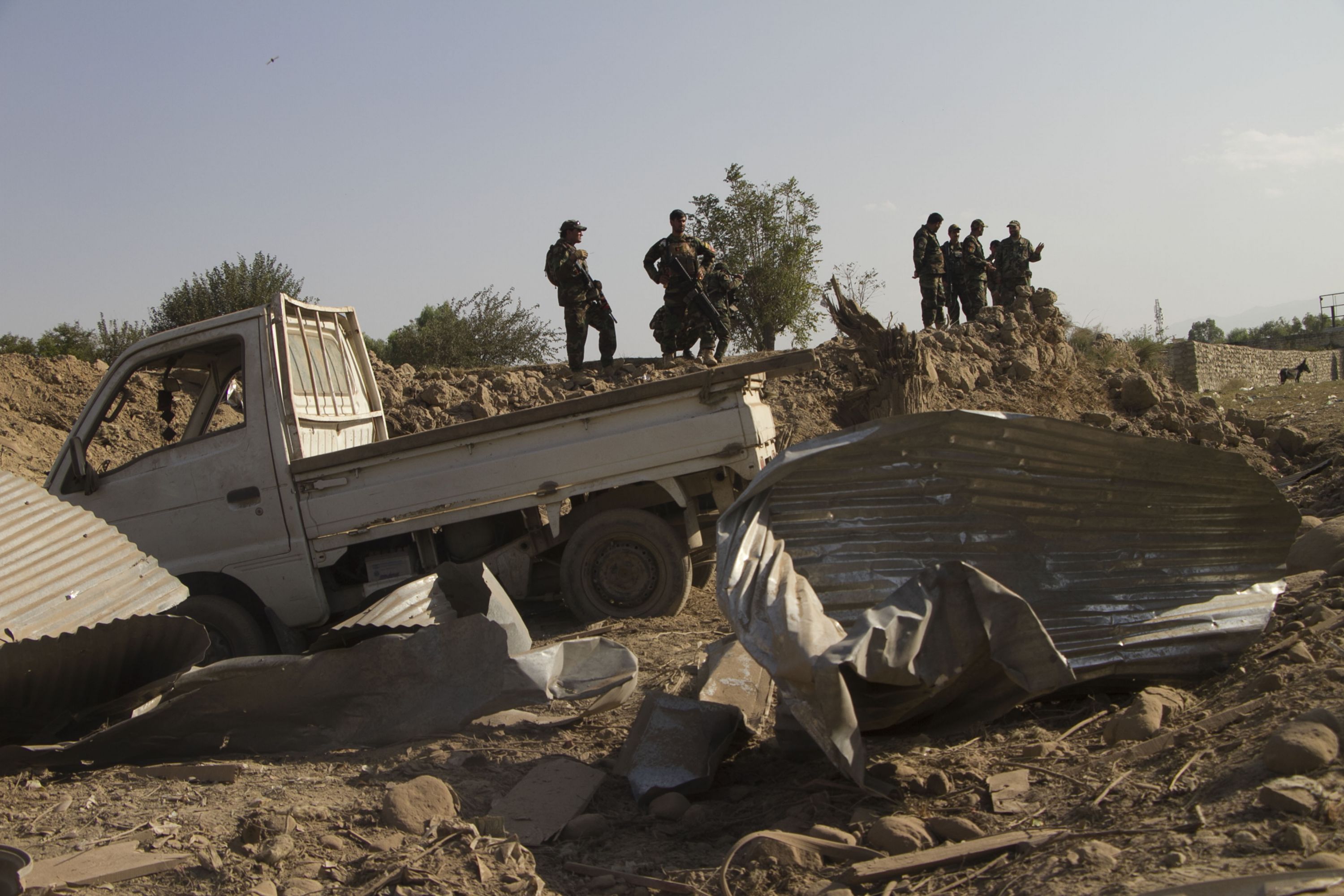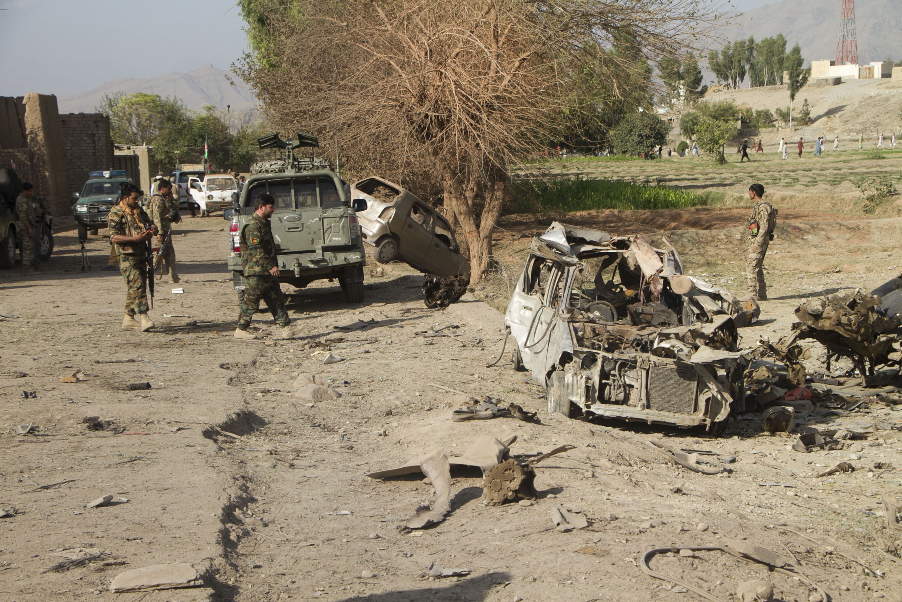 10月3日,在阿富汗楠格哈尔省辛瓦尔地区,安全部队成员查看袭击现场。新华社发