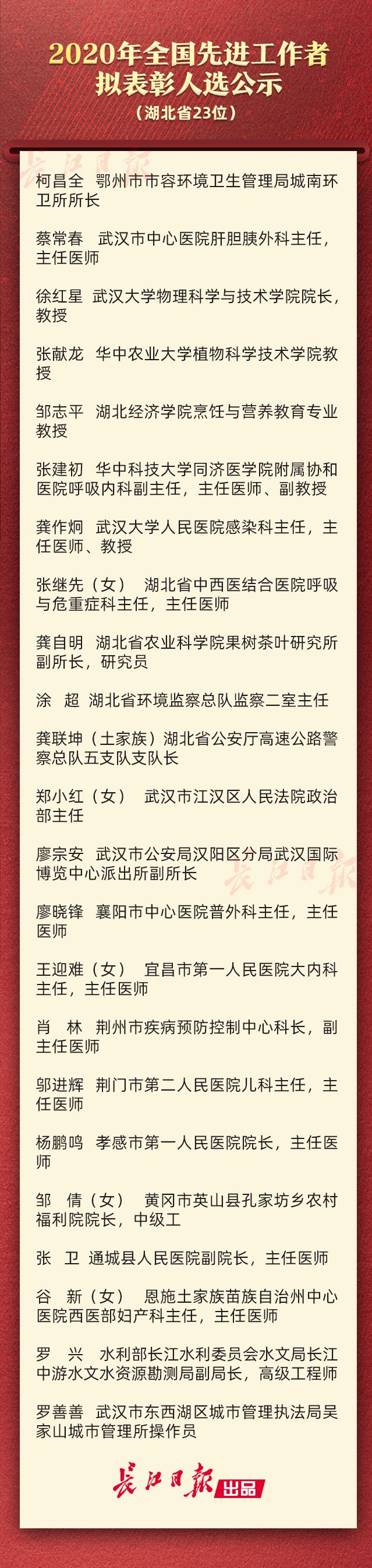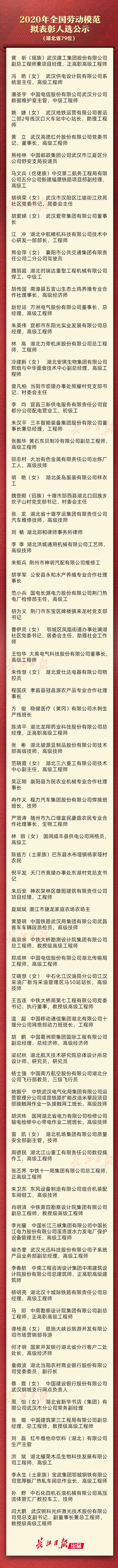 10月15日,2020年表彰全国劳动模范和先进工作者大会筹委会办公室公示2020年全国劳动模范和先进工作者拟表彰人选。湖北省张继先等102人上榜,其中全国劳动模范79人,全国先进工作者23人。具体名单如下: