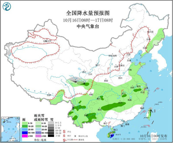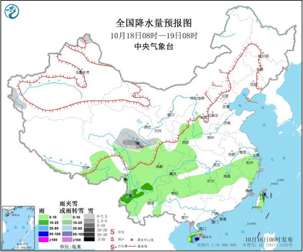 17日,新疆北疆北部和南疆西部山区、青海东南部、甘肃南部、川西高原北部等地的部分地区有小雪或雨夹雪,其中,青海南部等地局地有中到大雪。西北地区东部、江南大部、西南地区大部、西藏东部、海南岛、台湾岛等地的部分地区有小到中雨,其中,海南岛东部、台湾岛东北部、云南西北部局地有大雨或暴雨。