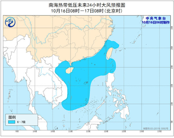 受热带低压和冷空气的共同影响,16日08时到17日08时,南海北部和中部偏北海域、琼州海峡、台湾海峡、巴士海峡、北部湾和西沙群岛附近海域有6-7级大风,部分海域有8级、阵风9级大风,南海南部和中部偏南海域有5-6级,阵风7-8级大风。