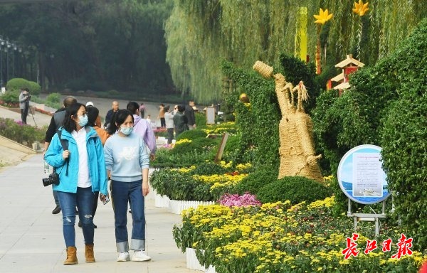 10月19日,这是汉口江滩永清门亲水平台上的菊花展台。2020年武汉金秋菊展将于10月20日在武汉各区启幕。 记者李子云 通讯员 卢丽娜 摄