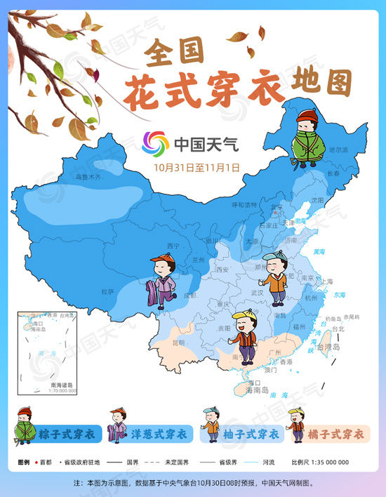 本周末(10月31日至11月1日)冷空气又双叒叕影响我国,穿厚了感觉热,穿薄点又冷,你还在纠结怎么穿衣服吗?中国天气网特别推出“全国花式穿衣地图”,看看粽子式、洋葱式、柚子式、橘子式哪种穿衣方法最适合你?让你穿衣不发愁。