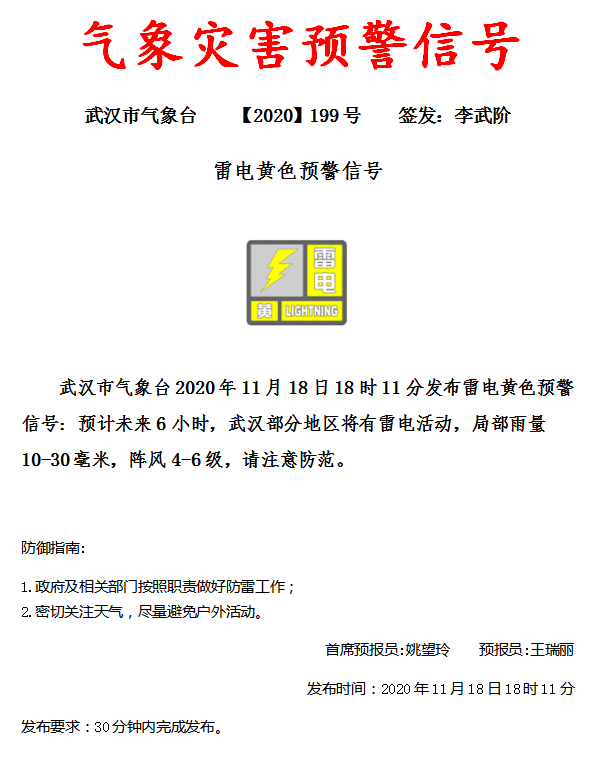 长江日报-长江网11月18日讯(记者龚萍 通讯员黎娜)11月18日18时11分,武汉市气象台发布雷电黄色预警信号:预计未来6小时,武汉部分地区将有雷电活动,局部雨量10—30毫米,阵风4—6级别,请注意防范。这也宣告着,一轮强对流天气正式到来。