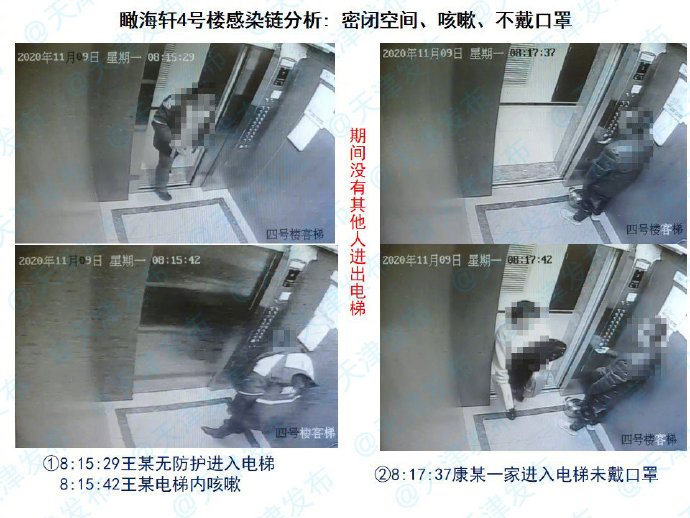 近日,天津东疆港区瞰海轩小区接连出现8名新冠肺炎病毒感染者,针对这起疫情,在今天天津市举行的第155场新型冠状病毒肺炎疫情防控工作新闻发布会上,天津市疾控中心副主任张颖公布了该小区病毒追溯结果。经过视频调查,最终发现,第一例检测出新冠病毒核酸阳性的王某,在电梯内并未佩戴口罩,并出现咳嗽、打喷嚏的情况,最终导致病毒在小区内传播。
