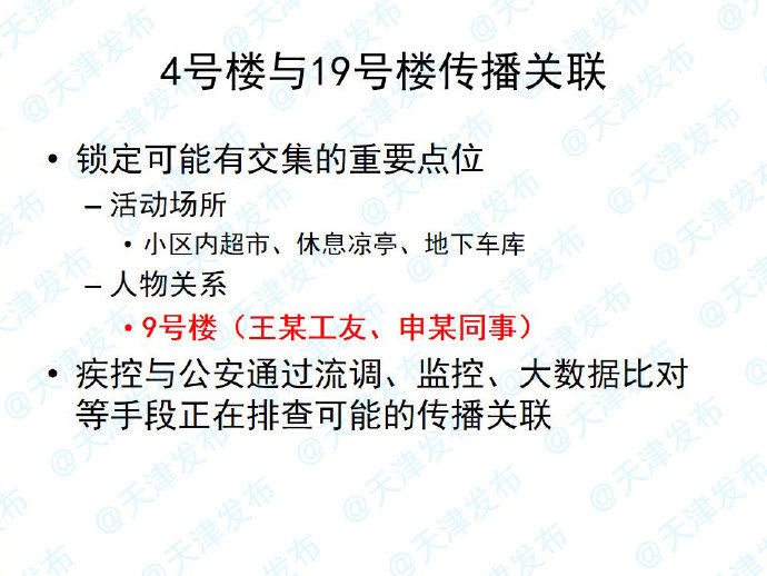 通过流行病学调查发现,9号楼里面有人员的交叉,9号楼里面住着4号楼感染者王某的工友,还住着在19号楼里面工作申某的同事。