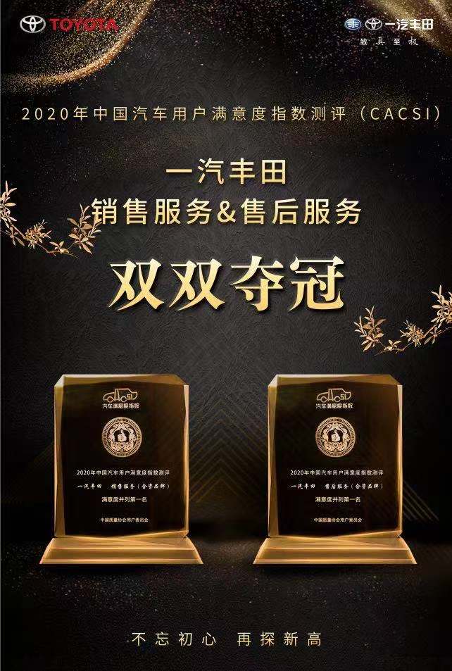 一汽丰田旗下产品与市场主流车型同台竞技,在2020年中国汽车行业用户满意度指数(CACSI)评测中,摘得合资品牌销售服务满意度指数以及售后服务满意度指数双料冠军。其中,威驰、亚洲龙、普拉多强势夺得各自级别车型用户满意度指数冠军,卡罗拉、RAV4荣放摘得所属细分市场亚军,奕泽 IZOA获得季军。
