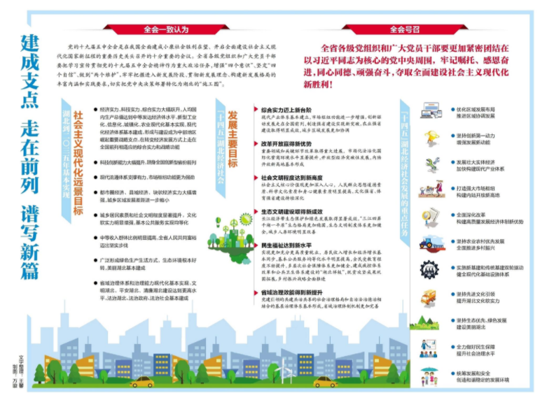 党的十九届五中全会是在我国全面建成小康社会胜利在望、开启全面建设社会主义现代化国家新征程的重要历史关头召开的十分重要的会议。全省各级党组织和广大党员干部要把学习宣传贯彻党的十九届五中全会精神作为重大政治任务,增强“四个意识”、坚定“四个自信”、做到“两个维护”,牢牢把握进入新发展阶段、贯彻新发展理念、构建新发展格局的丰富内涵和实践要求,切实把党中央决策部署转化为湖北的“施工图”。