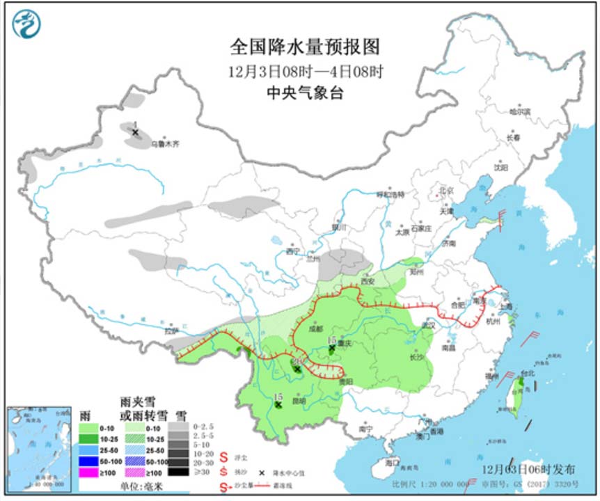 12月上旬,天气舞台主角主要是冷空气。预计今明两天(12月3日、4日),随着冷空气南下,中东部大范围区域气温将陆续“触底”,度过今年下半年来最冷清晨。降水方面,西南地区仍阴雨不断,而华南一带,降水稀少,气象干旱持续。