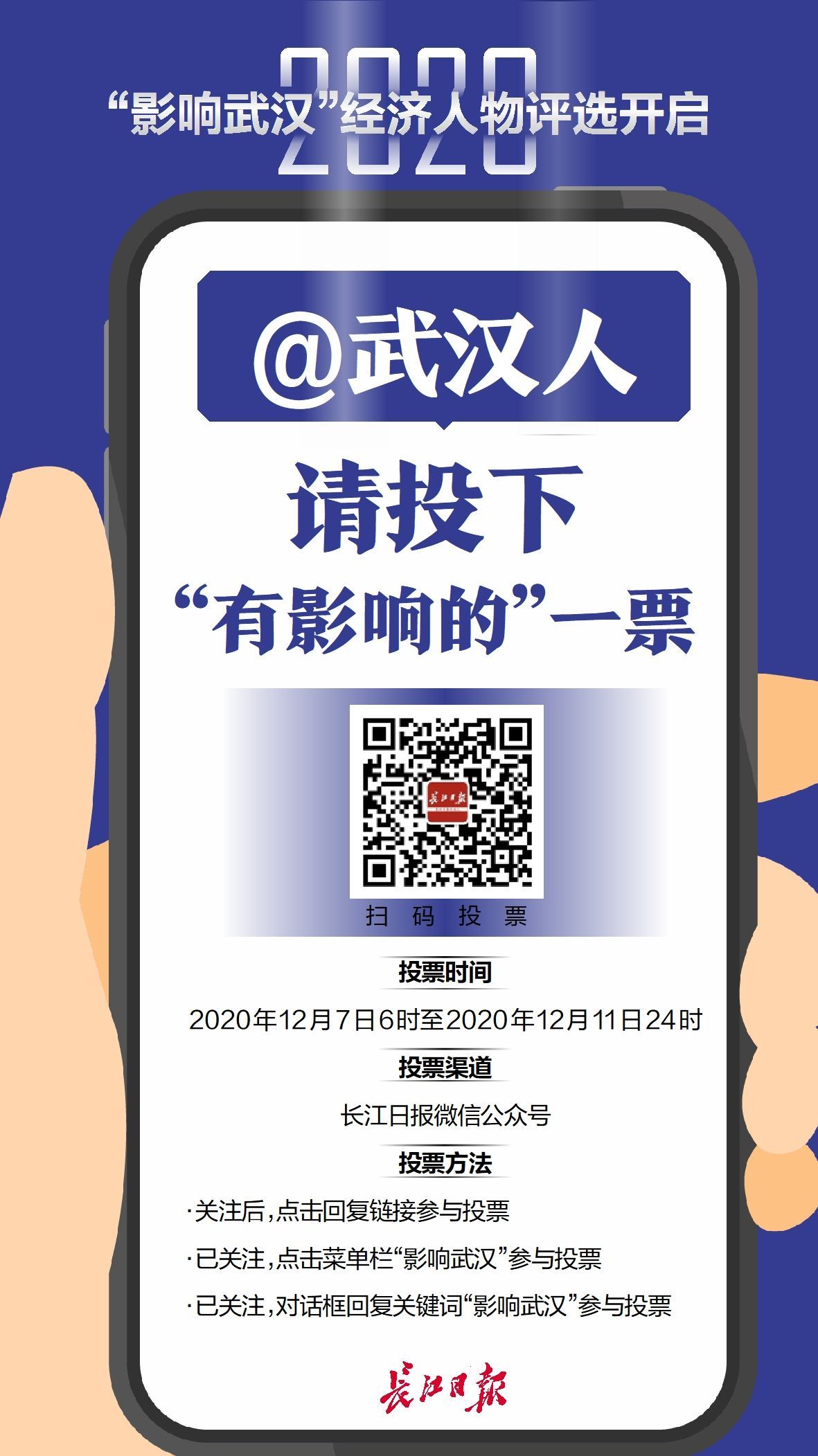 本次投票将于12月11日截止,每个账号每天可投5票且必须投给不同候选人。得票情况将计入2020“影响武汉”经济人物评选的总分。