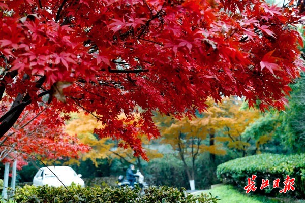 8日,武汉大学枫园里的枫香、三角枫、八角枫等树木,呈现出赤、橙、黄、绿、紫的瑰丽色彩。 记者杨涛 摄