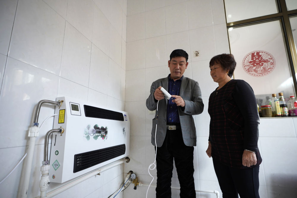 河北省隆尧县杨河村村委会委员王梦云(左)在给村民魏贵芬讲解电采暖设备的使用方法(2019年10月31日摄)。新华社记者 邢广利 摄