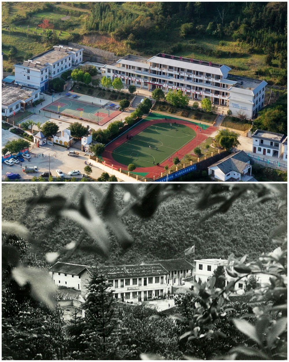 拼版照片:上图为2019年11月5日拍摄的贵州省荔波县瑶山民族小学面貌(无人机照片,新华社记者杨文斌摄);下图为荔波县瑶山民族小学旧貌(资料照片,荔波县瑶山瑶族乡人民政府供图)。新华社发