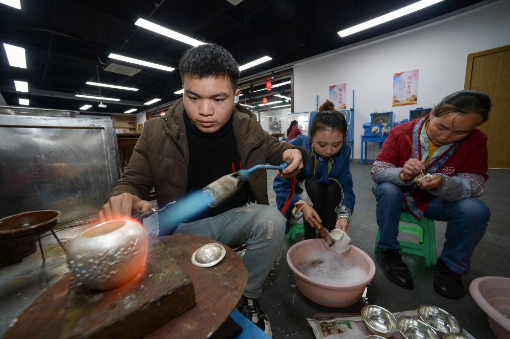 贵州省丹寨县一家银饰加工企业的工人在加工银器(2020年11月17日)。新华社记者 杨楹 摄