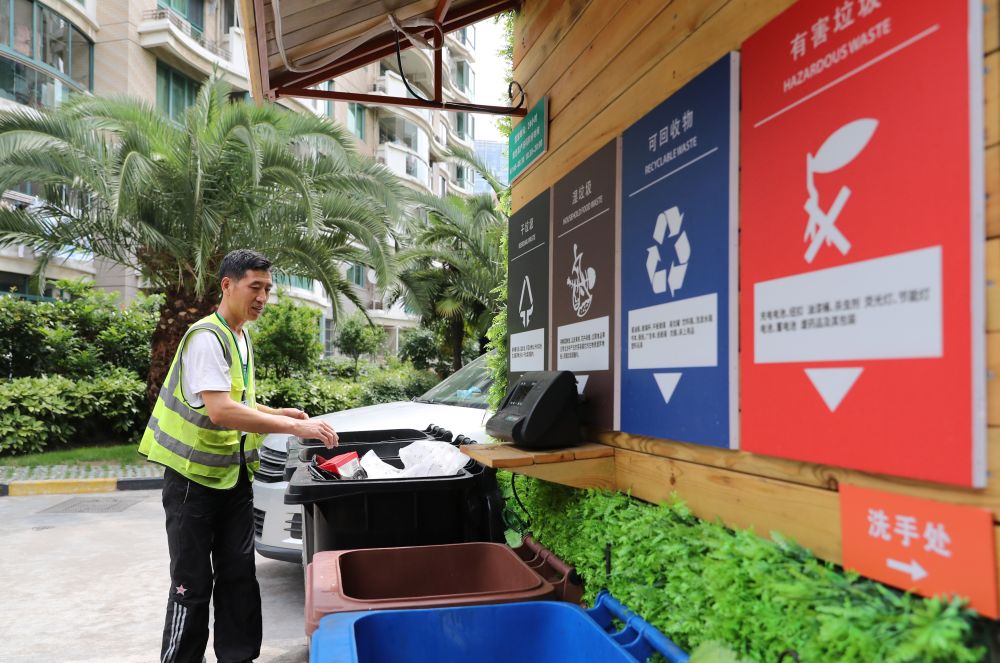 在上海市虹口区嘉兴路街道一处小区,保洁工对居民分类投放的生活垃圾进行分拣(2019年6月24日摄)。新华社记者 方喆 摄
