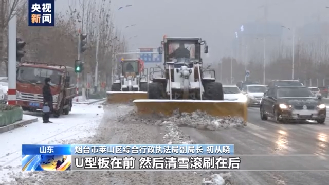 烟台市莱山区综合行政执法局副局长 初从晓:首先用大型的U型板推雪板先作业一遍,U型板在前,然后清雪滚刷在后,滚刷作业完毕之后,如果积雪还很厚,我们就采取大型推雪板再补充作业一遍。