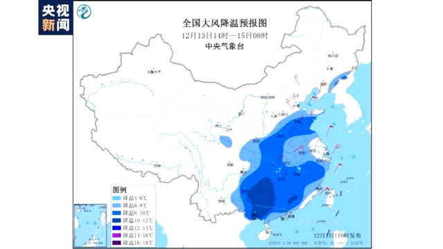 强冷空气从昨天(12日)开始影响我国,给北方多地带来了大风降温和雨雪天气。今天,随着它快速南下,降温范围向南扩展,南方还将迎来大范围雨雪,中央气象台上午10点继续发布寒潮蓝色预警。