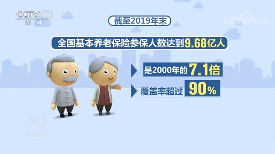 截至2019年末,全国基本养老保险参保人数达到9.68亿人,是2000年的7.1倍,覆盖率超过90%。城市和农村最低生活保障标准与2007年刚建立时相比,分别提高了2.4倍和5.4倍。退休人员基本养老金从2005年起保持16年连涨。民生安全网不断织密扎牢,社会保障服务能力明显增强。