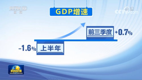 这是一张今年中国经济主要指标转正时间表,从4月份开始,工业、服务业、进出口、消费、投资陆续由负转正。前三季度,GDP同比增长0.7%,增速比上半年加快2.3个百分点。中国经济站稳了脚跟、恢复了元气。