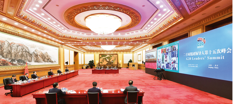 2020年11月,习近平以视频方式出席二十国集团领导人第十五次峰会第二阶段会议,重点阐述关于可持续发展问题的看法。