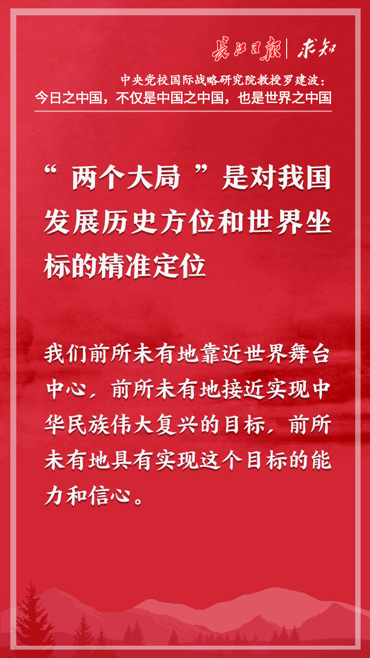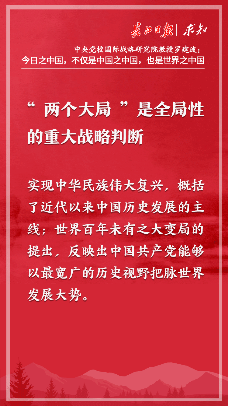 “两个大局”是关于国内国际发展大势的战略判断。中国如何发展,世界走向何方?这是我们观察中国和世界必须回答的首要问题。实现中华民族伟大复兴,概括了近代以来中国历史发展的主线,以最恢宏的气势描绘出历代仁人志士追求的伟大梦想。新时代中国共产党人肩负的历史使命,就是要凝聚全党全军全国各族人民的意志,锐意开拓进取,推进改革开放,为实现“两个一百年”奋斗目标和中华民族伟大复兴的中国梦而不懈奋斗。世界百年未有之大变局的提出,反映出中国共产党能够以最宽广的历史视野把脉世界发展大势,能够以最博大的全球胸襟关照人类社会的共同福祉。放眼世界,伴随科学技术的突飞猛进,以及一大批新兴经济体和发展中国家的群体性崛起,经济全球化、世界多极化、文化多样化、社会信息化深入发展,以西方为中心的国际秩序正在发生具有历史意义的大变化。