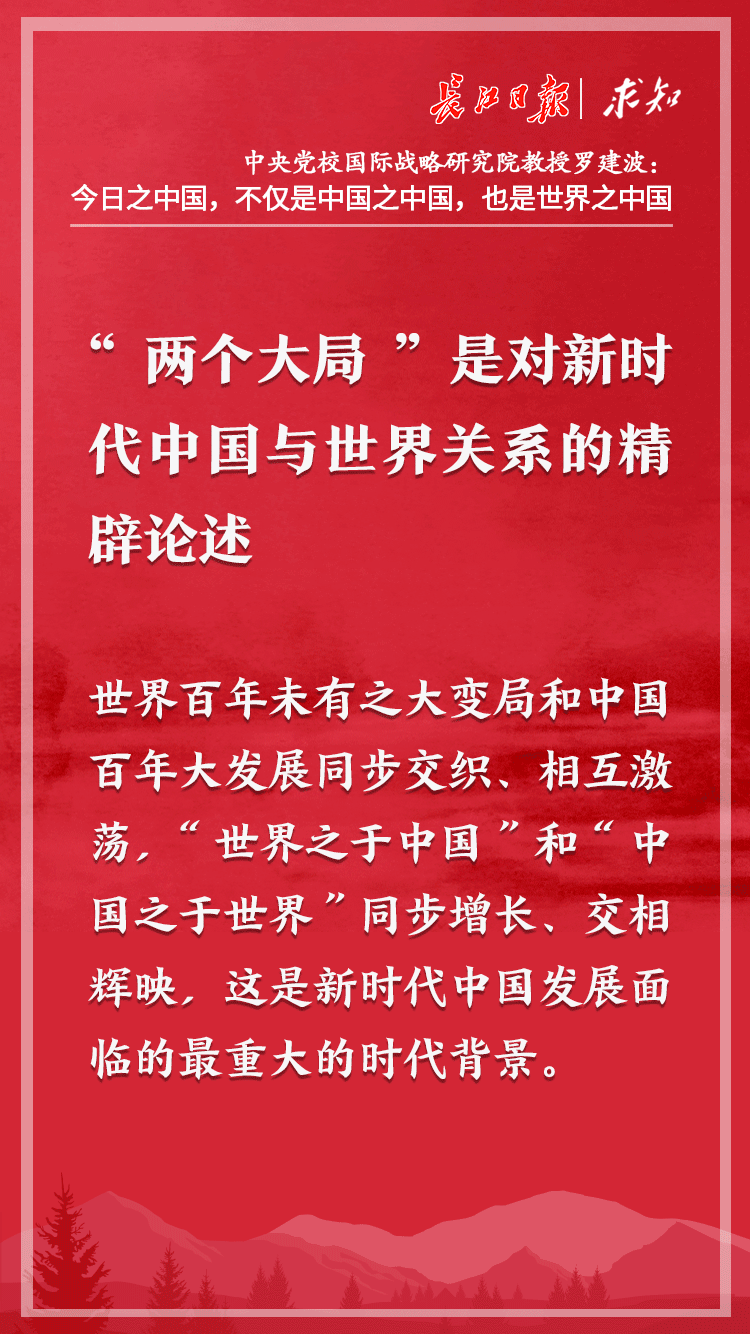 “两个大局”是对新时代中国与世界关系的精辟论述。今日之中国,不仅是中国之中国,也是世界之中国。世界百年未有之大变局为实现中华民族伟大复兴创造了重要的外部条件,为中国全面参与经济全球化并提升在世界的影响力和话语权提供了重要的历史契机。中华民族伟大复兴是世界百年未有之大变局的重要推动力量,为世界经济发展、国际格局演变乃至国际秩序的变革和完善提供了重要动能。习近平总书记指出,中国与世界关系正在发生深刻变化,我国同国际社会的互联互动也变得空前紧密,我国对世界的依靠、对国际事务的参与在不断加深,世界对我国的依靠、对我国的影响也在不断加深。世界百年未有之大变局和中国百年大发展同步交织、相互激荡,“世界之于中国”和“中国之于世界”同步增长、交相辉映,这是新时代中国发展面临的最重大的时代背景。