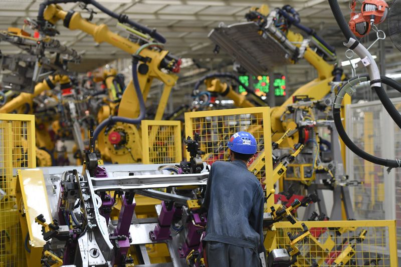 2020年9月15日,在上汽集团乘用车宁德基地车身车间,工人操作机器人分拼汽车板材。