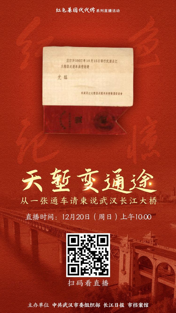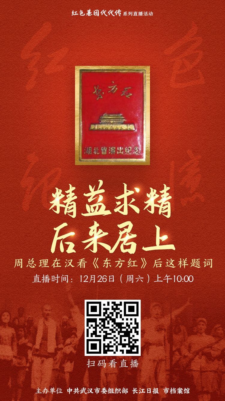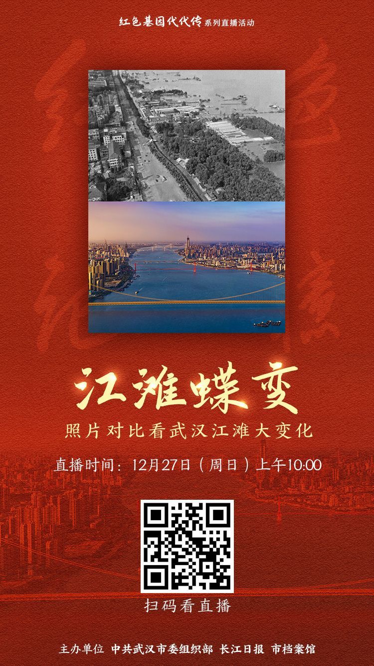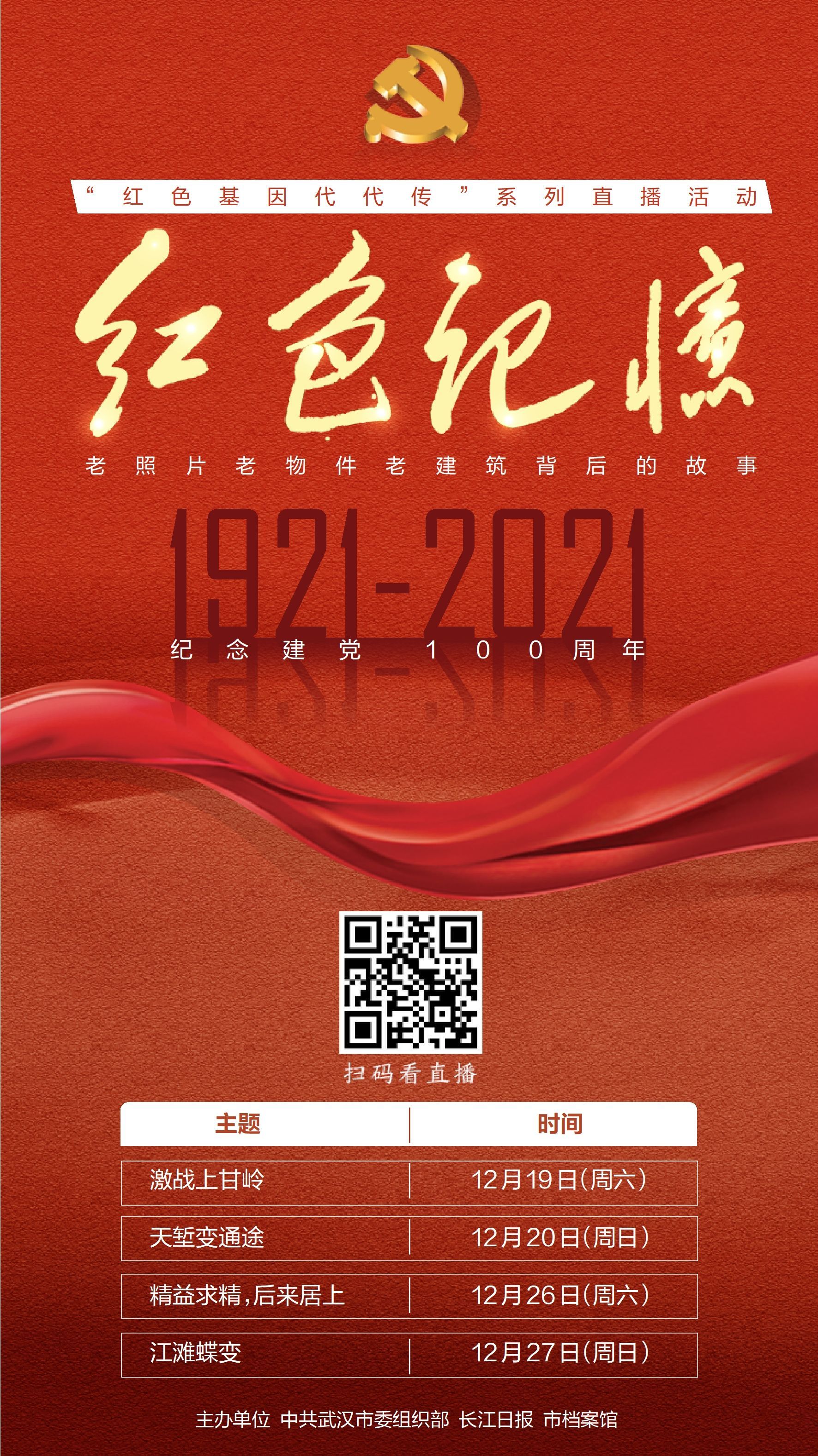 首场直播,时间是12月19日(周六),题为“激战上甘岭:抗美援朝老战士李汝楠的军功章”;第二场直播,时间是12月20日(周日),题为“天堑变通途:从一张通车请柬说武汉长江大桥”;第三场直播,时间是12月26日(周六),题为“精益求精,后来居上:周总理在汉看《东方红》后这样题词”;第四场直播,时间是12月27日(周日),题为“江滩蝶变:照片对比看武汉江滩大变化”。