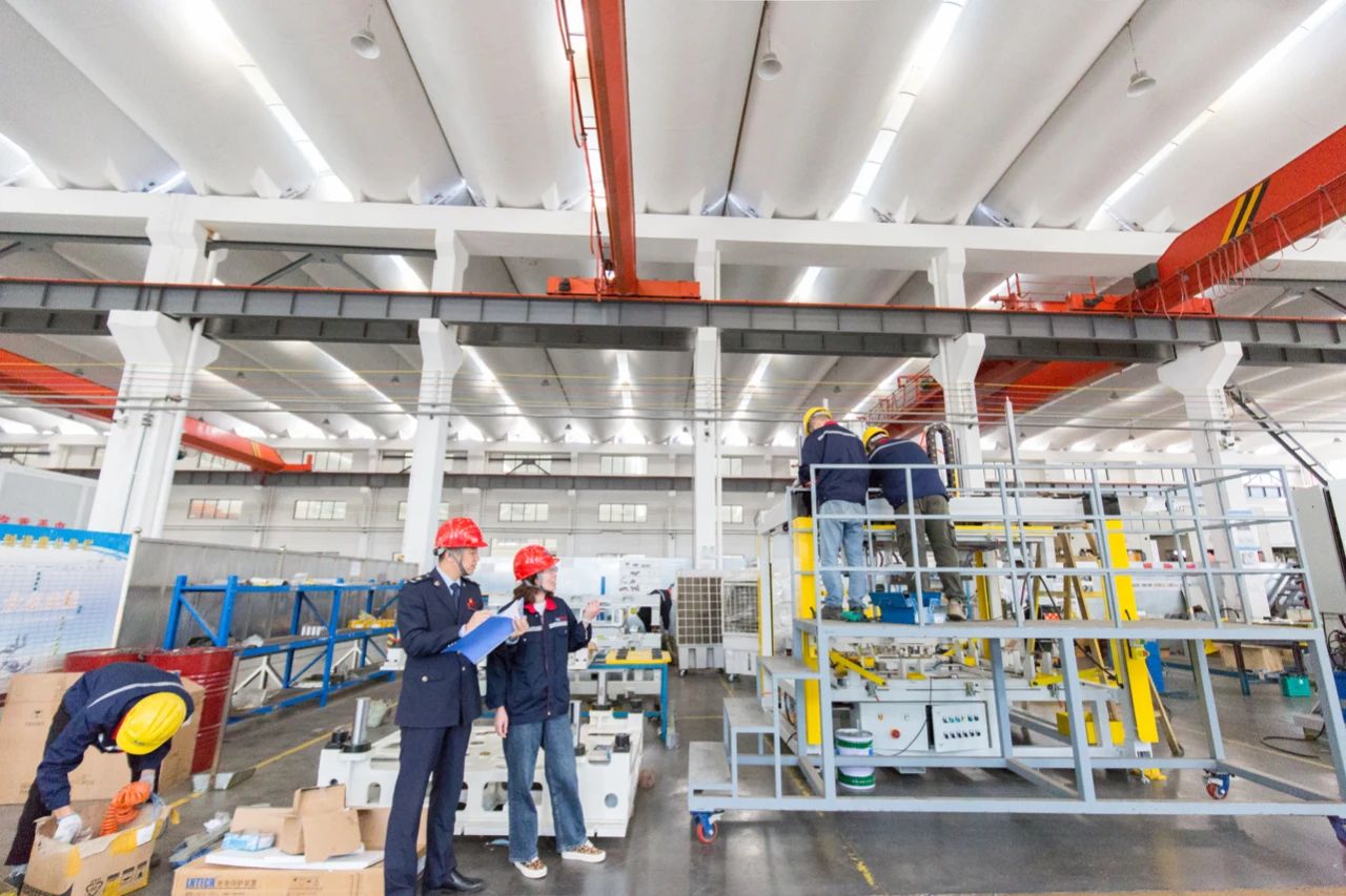 2020年10月10日,在江苏南通如皋市瀚皋机械设备有限公司生产车间内,税务局工作人员在对出口产品订单量及生产情况进行实地了解。