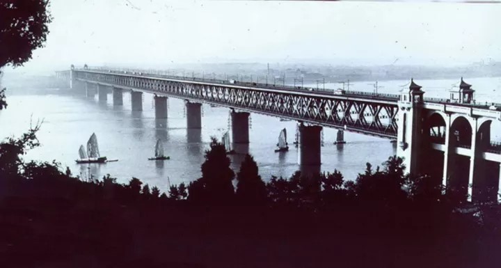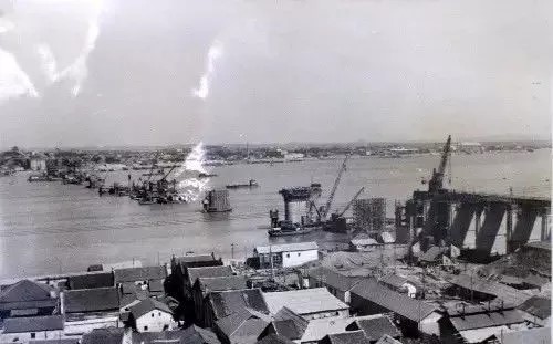 资料图片:江上的帆船排成一列从桥下鱼贯而过,数年以后江上交通的主力变成动力船舶,此种景象不复。