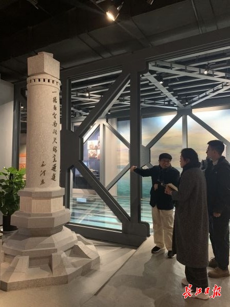 在桥梁博物馆,余启新向长江日报-长江网记者介绍大桥的大型管柱钻孔基础工艺。 通讯员刘佩娅 摄