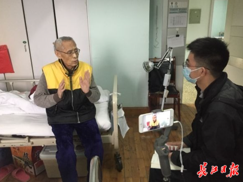 今年90岁的国家一级编导梁晋老人,在武汉中医医院接受长江日报直播采访。记者万建辉 摄