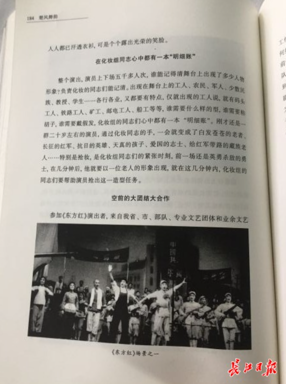 书中《东方红》演出剧照显示,演员扮演的角色以群像出现在舞台上。梁晋老人说,《东方红》的演员多达1000多人,许多是来自武锅、武重等国企的表演爱好者。台上经常有上百人同时表演,一幕结束,灯光变暗,5秒钟内,舞台上的一百人下来,后台的另一百名演员上台,整个过程可以做到鸦雀无声。后台的道具,像红旗、火炬、大刀、长矛、斗笠,大大小小2000多件,分门别类摆放,不同场次的演员使用道具有序,很少出错。