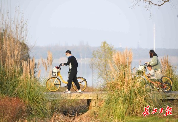27日,冬日暖阳洒满武汉东湖绿道,一些市民来到湖畔晒太阳和亲子运动,享受温暖的休闲时光。 记者高勇 摄