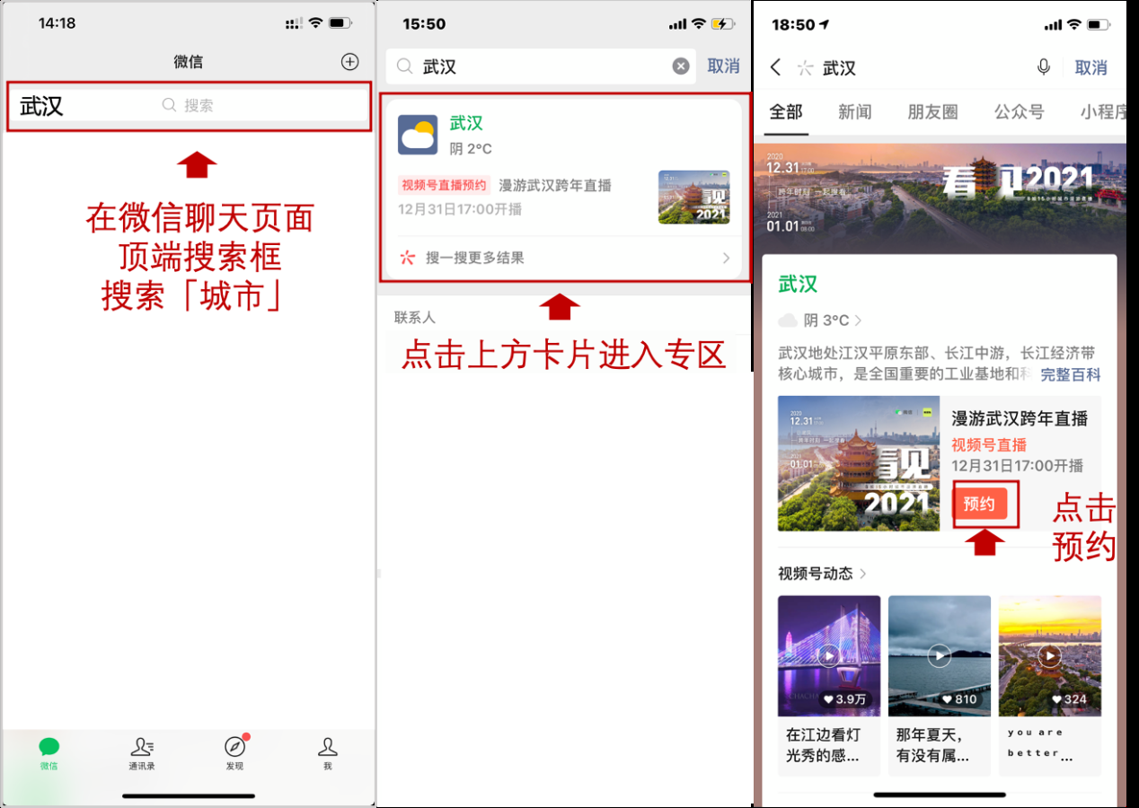 现在在微信聊天页面顶端搜索框输入「北京、上海、广州、深圳、杭州、武汉、长沙、重庆」任一城市,点击上方卡片,进入城市专区,点击专区卡片右侧「预约」按钮,开播时就能在第一时间收到提醒啦!