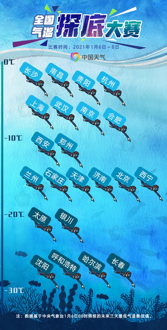 一场全国气温探底大赛正式拉开帷幕,此次将有7个省会级城市最低气温在-20℃以下,长春甚至将挑战-29℃;有8个城市气温探至-10℃以下,其中北京、石家庄、兰州、济南、太原等地最低气温将下降至-15℃或以下,均会在明天迎来今冬最冷的一天,分分钟体验被“冻透”。