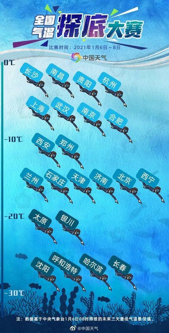 6日,我国进入此次寒潮过程中的核心降温时段。中央气象台6日18时继续发布寒潮蓝色预警。一场全国气温探底大赛已拉开帷幕,北方大部地区最低气温不足-10℃。南方各城市气温则会在7日至8日触底。