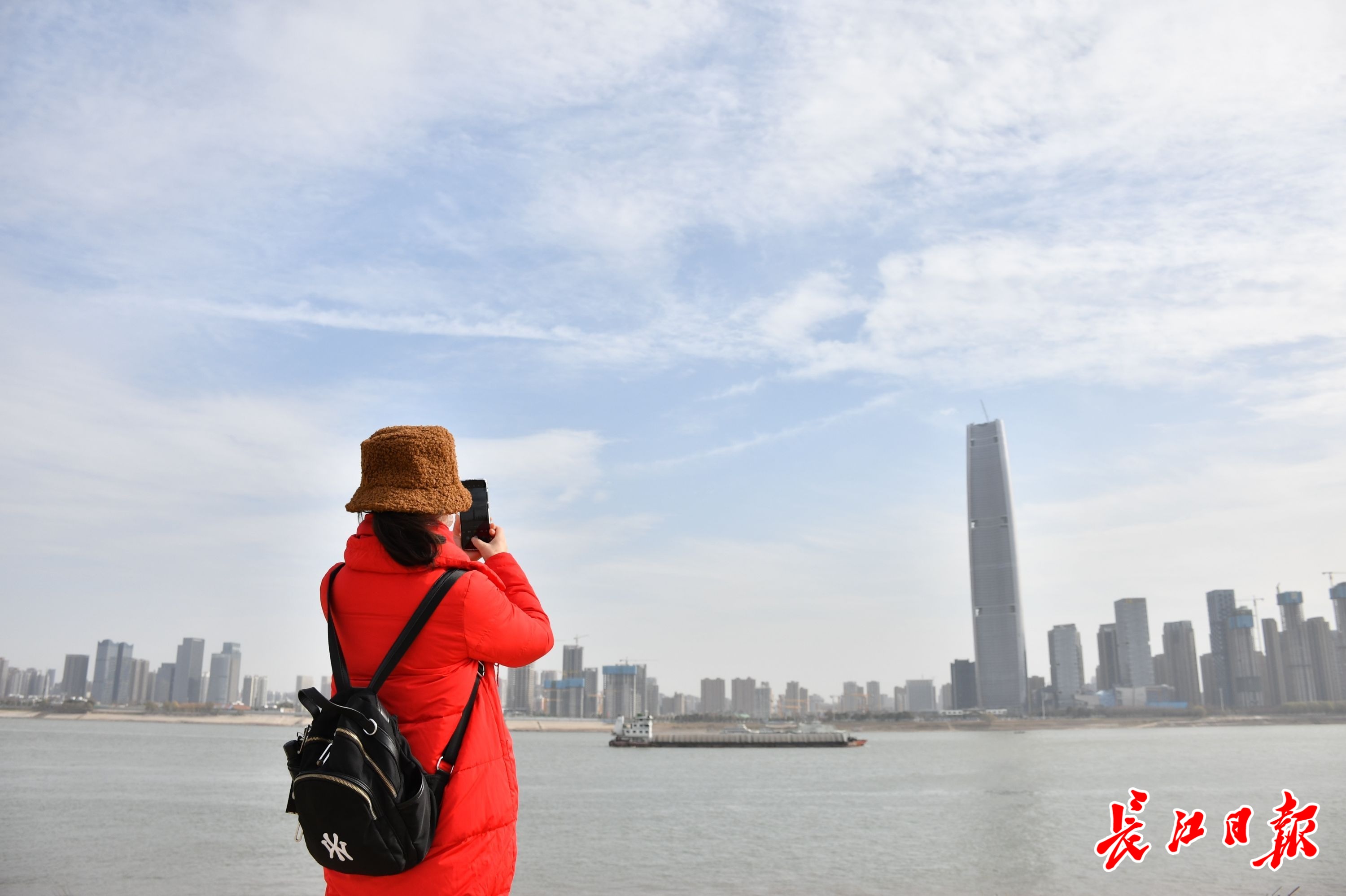 7日,汉口江滩公园里,市民用手机拍摄长江两岸蓝天白云下的风景。记者詹松 摄