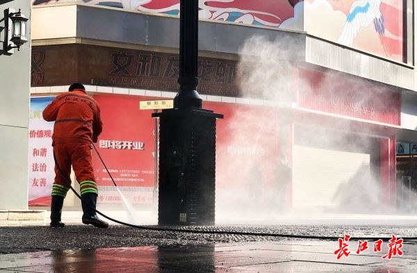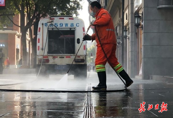 1月13日,天气晴朗,上午9时许,江汉路步行街游人较少,环卫人员立即抓紧时间对步行街大清洗。记者刘斌 摄