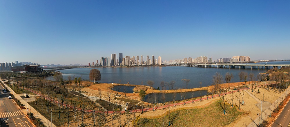 东侧绿道在湖畔新建的湿地景观中向前延伸,一直通向四环线引桥下面。行走其上,可以无障碍地饱览汤逊湖两岸美景。对岸是林立的高楼大厦,现代都市风格鲜明;中间是宽阔的湖面,不时可见水鸟飞舞;近岸是建设得既精致,又保留了几分野趣的湖泊湿地景观。